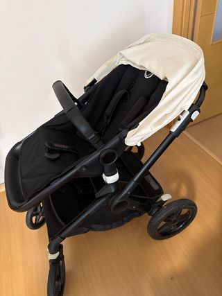 Carrito Bugaboo Fox 2 en color negro y capota beige. - Chasis negro. - Capota extensible beige. - Asiento reversible. - Ruedas todoterreno. Incluye caja original con capazo y manual de instrucciones. Adicionalmente tiene una colchoneta y capota para verano. Funda de lluvia y sombrilla nuevas.