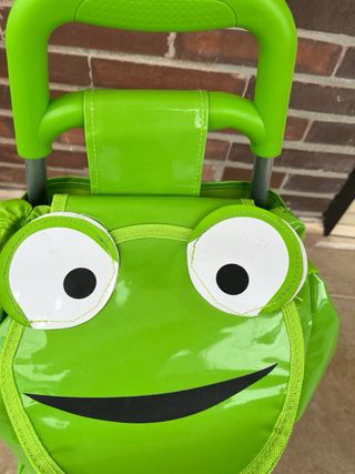 Carrito de compra con diseño de rana. - Color verde brillante. - Ruedas para facilitar el transporte. - Asa plegable. - material lavable. - la cremallera trasera hay que engrasarla y ponerle la pestaña para que cierre y abra. - Todo lo demás (rueda, asa, bolso,...) está en perfectas condiciones.