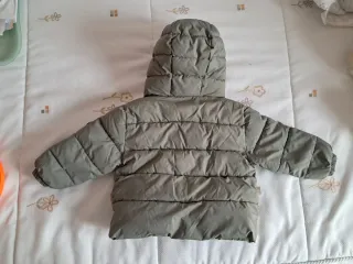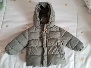 Abrigo acolchado para bebé de MANGO, ideal para mantener el calor en los días fríos. - Color verde oliva. - Cierre con cremallera y botones de madera. - Capucha integrada. - Bolsillos laterales. - Muy calentito. - Muy cómodo para ir sentado en el carrito. . Sin apenas uso. - Precio en tienda 28€.