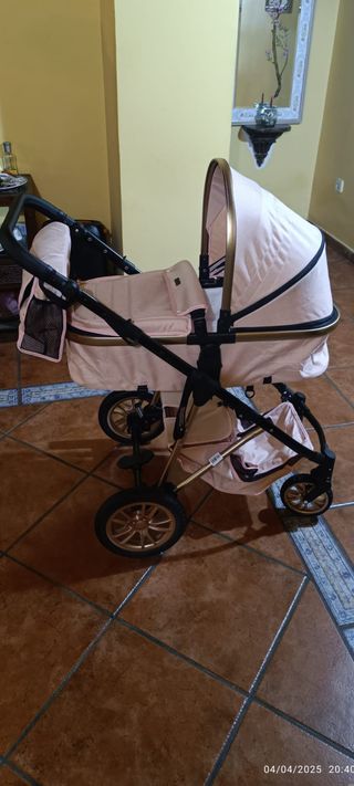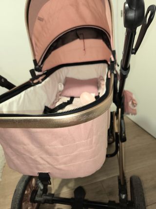 Conjunto de carrito de bebé en color rosa, ideal para paseos cómodos. Incluye varios accesorios. Se puede negociar precio - Diseño acolchado con detalles en color oro. - Capazo convertible en silla. - Silla de coche grupo 0. - Adaptadores para silla de coche. - Colchoneta y plástico de lluvia.
