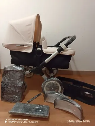 Carrito de bebé Bugaboo Donkey Duo. - Chasis negro. - Capazo y silla en color beige. - Incluye ruedas y accesorios.