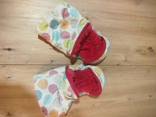 Manoplas para carrito de bebé con un divertido estampado de lunares. - Estampado de lunares multicolor. - Forro interior de terciopelo rojo.