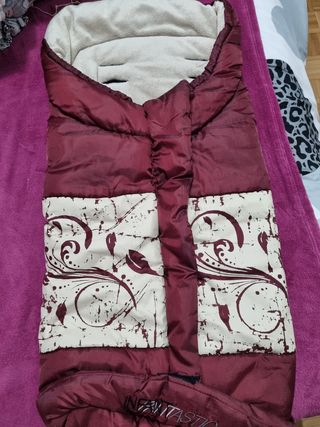 Saco universal para carrito de la marca Marilo. De color beige con topos blancos en un lado y blanco con topos beige en el otro lado. Luego hay un borde muy bonito de color blanco con rayas beige. Es muy bonito, abriga bien y esta como nuevo.