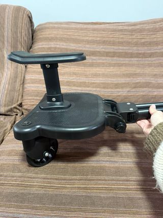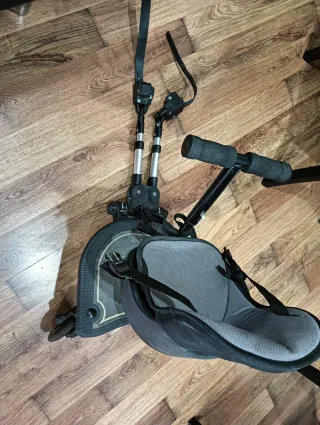 Accesorio para carrito de bebé que permite que un niño mayor vaya de pie o sentado. - Asiento acolchado. - Arnés de seguridad. - Barra de manillar. - Conexiones ajustables. - Ruedas con luces.