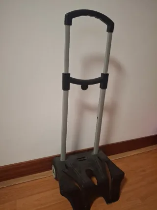 Carrito de ruedas para mochila, ideal para facilitar el transporte. - Estructura de metal y plástico. - Asa ajustable. - Base estable.
