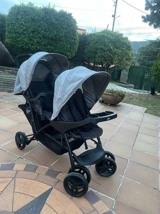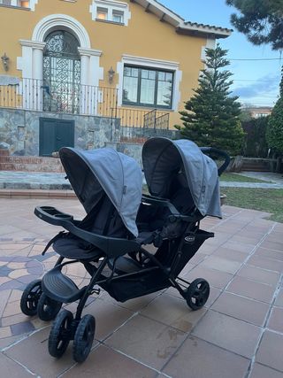 Carrito doble de la marca Graco, ideal para hermanos o gemelos. Diseñado para la comodidad y el paseo. - Dos asientos independientes. - Capotas ajustables. - Cesta de almacenamiento inferior. - Ruedas delanteras giratorias. Carrito con solo 2 meses de uso, prácticamente nuevo.