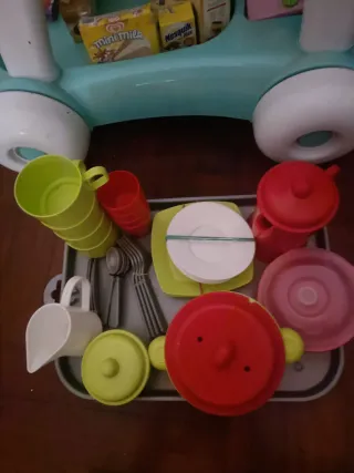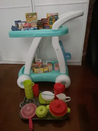 Juego de carrito con 27 productos. También va un juego de vajilla con vasos tazas cucharas café puchero etc - Carrito de compra de plástico en color menta y blanco. - Incluye una variedad de productos de juguete. - Set de vajilla de plástico con platos, vasos y ollas.