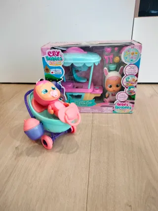 Se vende lote de Bebés Llorones que incluye un carrito y una tienda. - Muñeca Bebé Llorón con carrito. - Tienda de repostería. - Accesorios incluidos. Carrito de cony el conejo y coche de fancy. El carrito está nuevo sin estrenar aunq la caja está ligeramente dañada