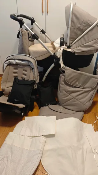 Carrito Silver Cross en color beige y negro, con varios accesorios. Capazo.Silla. varios sacos. 2 burbujas de lluvia para el capazo y para la silla. Colchoneta para la silla - Capazo. - Silla. - Bolso. - Funda para silla. - Protectores de lluvia.