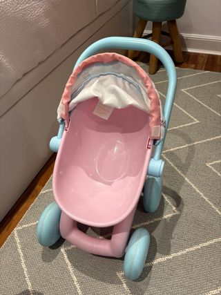 Carrito de muñecas con un diseño encantador y práctico. - Color principal: rosa. - Capota con estampado de figuras. - Ruedas de color crema. Original 59 euros. Fue un regalo que no ha utilizado. Se regala bebe que hace ruido de risa, pis y pedos.