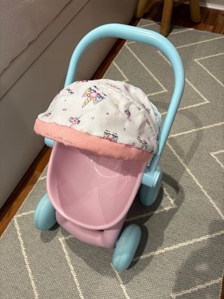 Carrito de juguete para muñecas, ideal para horas de diversión. - Estructura principal en color rosa. - Incluye capazo con estampado de flores y pájaros. - Asa acolchada para un agarre cómodo. - Cesta inferior para llevar accesorios. Tiene un poco levantada la pintura. Una picadita. Se ve en una foto.