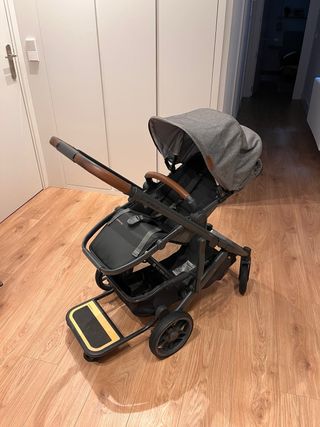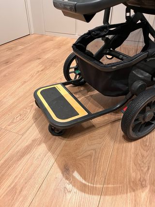 Accesorio para carrito de bebé que se acopla fácilmente. - Plataforma con superficie antideslizante. - Barra de sujeción ajustable. Se ha utilizado en un par de ocasiones