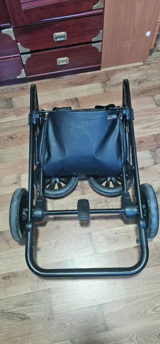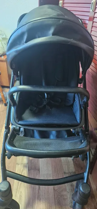 Carrito de bebé en color negro, con un diseño moderno y funcional. - Estructura metálica resistente. - Ruedas para fácil movilidad. - Tiene dos defectos que durante más de un año y medio no me soponieron ningún problema, el freno de la rueda derecha no funciona y la silla solo tiene la posición que se ve en la foto, se puede inclinar pero algunas veces se atasca, creo que se puede pedir la silla y/o la cuna de la página oficial de Anex. La he usado más de un año y medio y me ha ido de maravilla.