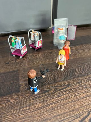 Set de moda Playmobil con figuras y accesorios. - Incluye figuras de moda y cámara. - Carrito de ropa con vestidos. - Expositor de sombreros y bolsos. literalmente esta nuevo