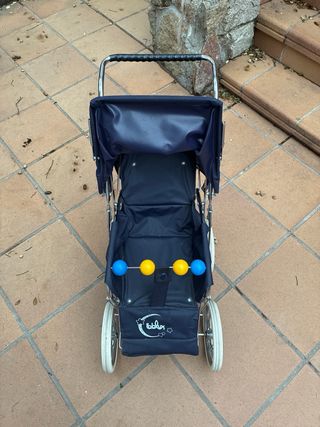 Carrito de muñecas de la marca Bebelux en color azul marino. Un clásico para jugar. - Estructura metálica. - Capota plegable. - Ruedas blancas. - Incluye barra con 4 bolas de colores (azules y amarillas).