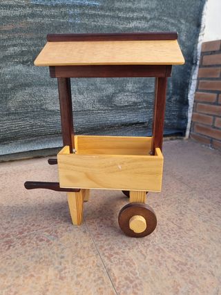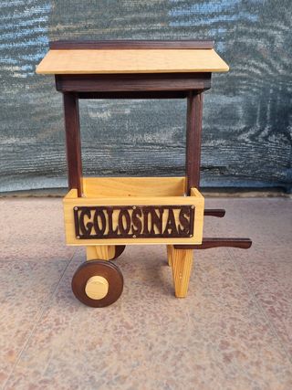 Carrito decorativo de madera, ideal para exhibir golosinas o dulces. - Fabricado en madera de pino y detalles en madera oscura. - Inscripción GOLOSINAS en la parte frontal. - Diseño tipo carretilla con ruedas.