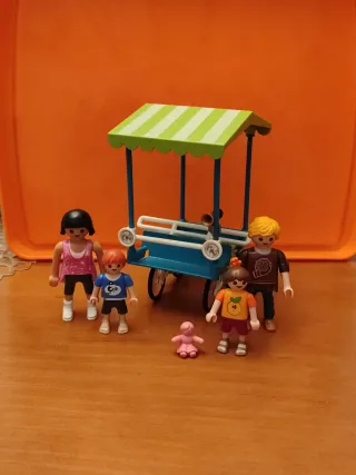 Set de Playmobil que incluye un bici con techo y varias figuras. - Carrito azul con techo a rayas verdes y blancas. - Incluye 4 figuras de Playmobil: 2 adultos y 2 niños. - El carrito tiene ruedas y un manillar, las ruedas no ruedan bien. - Está completa.