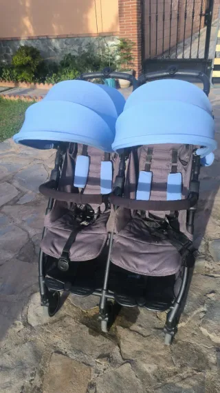 Carrito gemelar Baby Monster en color azul y gris, en muy buen estado por el poco uso. - Capotas individuales extensibles. - Arnés de seguridad de 5 puntos. - Asientos reclinables. - Cesta de almacenaje. - Plegado compacto.