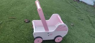 Bonito carrito de muñecas de madera, perfecto para jugar. - Diseño en color rosa y blanco. - Detalles de corazones y abanicos. - Ruedas para facilitar el movimiento.