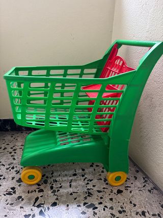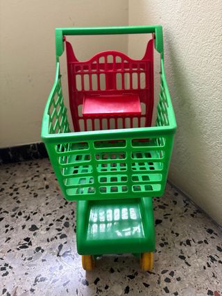 Carrito de supermercado de juguete, ideal para que los más pequeños jueguen a hacer la compra. Es de color verde con detalles en rojo y ruedas amarillas. - Material: Plástico resistente. - Diseño abierto en la cesta. - Asa para empujar. Tiene una pequeña raja indicada en la última foto