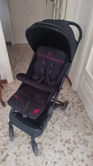 Carrito de bebé en color negro, con detalles en rojo y un diseño de avión. - Capota. - Arnés de seguridad de 5 puntos. - Barra delantera. - Ruedas delanteras giratorias.