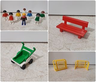 Lote de figuras y accesorios de Playmobil de los años 80 y 90. Incluye varias figuras de niños y complementos como un banco, un carrito y porterías. - Figuras de Playmobil. - Accesorios variados. - Piezas de colección de los años 80/90.