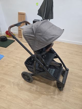 Silla de paseo Uppababy Cruz, en color gris. Está usado y un poco suelto pero perfectamente estable. - Incluye capota extensible para proteger del sol. - Asa de cuero marrón. - Cesta portaobjetos inferior.