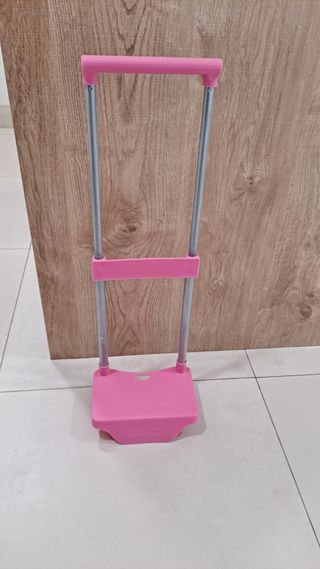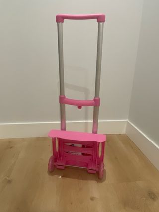 Carrito de plástico rosa para llevar mochilas. - Ruedas para facilitar el transporte. - Mango extensible.