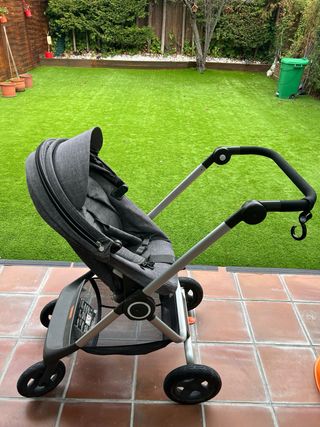 Carrito Stokke Scoot en color gris. - Diseño moderno y funcional. - Capota extensible. - Cesta de compras. - Ruedas todoterreno. - Capazo y silla para cuando crezca - 2 sacos, uno para capazo y otro para la silla - Funda para lluvia - Mosquitera - Guantes para llevar el carro