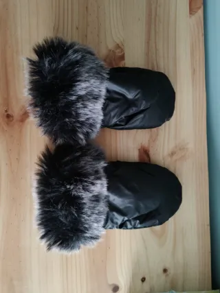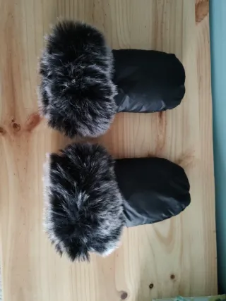 Manoplas forradas para carrito de bebé, ideales para mantener las manos calientes en invierno. - Exterior impermeable en color negro. - Forro interior de pelo sintético blanco. - Cierre con botones a presión.