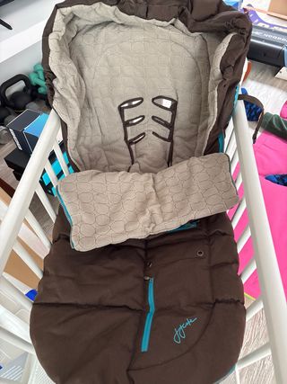 Saco de paseo acolchado y muy calentito, ideal para carrito de bebé en invierno. Interior de forro polar suave en color naranja y exterior marrón con diseño divertido y colorido de animalitos (zorrito, panda, etc.). Cuenta con cremalleras laterales para abrirlo fácilmente y ranuras traseras para pasar los arneses del carrito. Muy cómodo y práctico para mantener al peque abrigado en los días fríos. En buen estado, limpio y listo para usar.