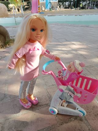 Muñeca Nancy con su bebé y carrito de la compra. - Muñeca Nancy con vestido rosa y pantalones plateados. - Bebé con conjunto rosa y gorrito. - Carrito de la compra rosa y blanco. - Incluye un conjunto de ropa para colgar en el carrito.