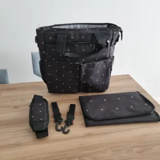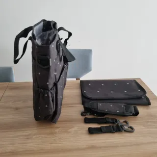 Bolso cambiador para carrito de bebé de color negro con estampado de estrellas. Incluye cambiador a juego, correa acolchada para el hombro y dos ganchos universales para poder colgarlo de cualquier modelo de carro. Todo está nuevo a estrenar. El cambiador tiene un pequeño defecto: una marca de doblez muy marcada (foto 4) Medidas: ancho 34cm, alto 38cm, fondo 12cm