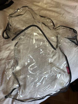 Protector de plástico transparente para carrito de bebé. Mantiene al bebé seco en días de lluvia. Marca be cool baby, pero es universal - Material: Plástico transparente. - Borde: Negro.