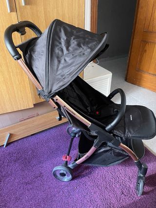 Carrito de paseo en muy buen estado, con un diseño elegante en color negro, perfecto para diario porque pesa poco y se pliega en un segundo - Estructura metálica. - Capota protectora. - Arnés de seguridad. - Barra frontal. - manillar acolchado y cómodo
