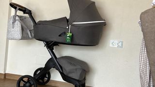 Carrito de bebé Stokke Xplory X en color gris. Un cochecito elegante y funcional. - Chasis negro. - Capazo gris. - Asa de manillar con acabado en símil piel marrón.