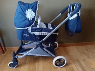 Bonito carrito para muñecas con un diseño clásico y elegante. - Color azul marino. - Capota decorada con flor blanca y encaje. - Incluye bolso a juego. - Cesta inferior de rejilla. Precio40€ NEGOCIABLE