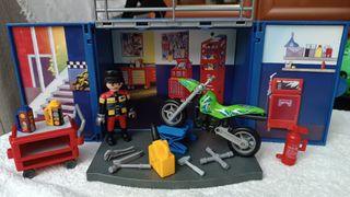 Set de taller de motos de Playmobil. - Incluye figura de mecánico. - Motocicleta verde. - Carrito de herramientas. - Accesorios de taller como extintor, bidones y herramientas. Todo lo que se ve en las fotos