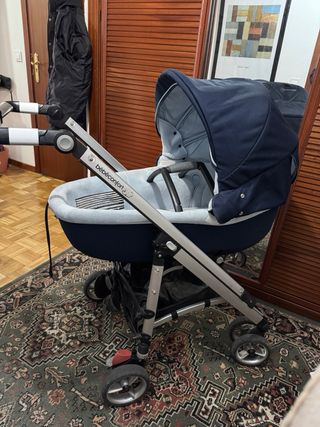 Carrito de bebé marca bebe confort en color azul marino. - Capota amplia. - Barra frontal. - Arnés de seguridad. - Reposapiés. - Ruedas delanteras dobles y traseras individuales. - Silla de pasea dos posiciones, con protector de lluvia - Capazo estilo Moisés - Estructura metálica NO HAGO ENVIOS, VENTA DOLO EN PERSONA