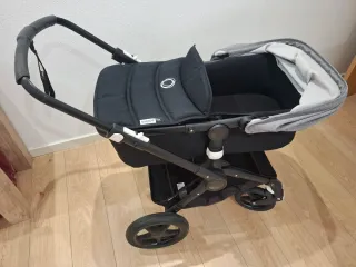 Carrito Bugaboo Fox en configuración 2 en 1. - Chasis negro. - Capazo y silla. - Capota gris. - Ruedas todoterreno. - Con cubierta para el capazo, acolchada hecha a medida.