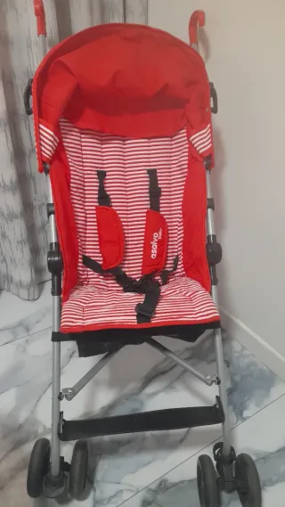 Carrito de paseo de la marca Asalvo baby en color rojo. - Diseño a rayas blancas y rojas. - Cinturón de seguridad de 5 puntos. - Estructura metálica. - Ruedas delanteras giratorias.
