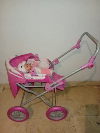Conjunto de muñeca y carrito de paseo. Precio no negociable no ago envios - Muñeca con ropa y gorro. - Carrito plegable con ruedas rosas.