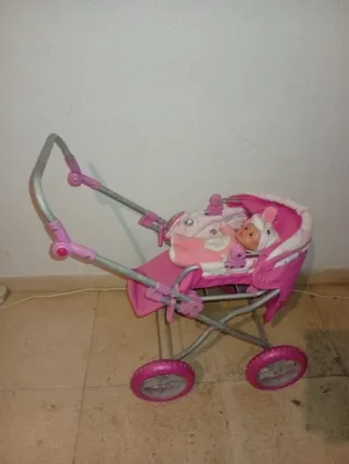 Conjunto de muñeca y carrito de paseo.precio no negociable no ago envios - Carrito de color rosa con detalles plateados. - Muñeca vestida con ropa a juego.