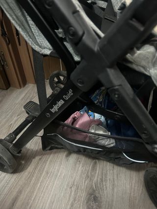 Carrito de bebé marca Inglesina, modelo Quid 2. Es ligero y fácil de plegar. - Color gris. - Cesta de almacenamiento inferior. - Ruedas delanteras giratorias.