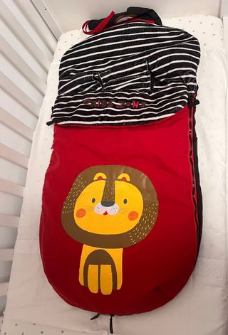 Saco para carrito de bebé con un divertido diseño de león y rayas. - Parte superior con rayas blancas y negras. - Parte inferior roja con aplicación de león. - Cierre de cremallera lateral.