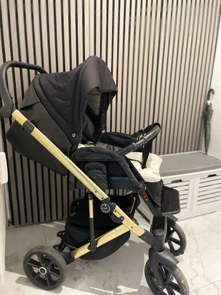 Carrito de bebé en perfecto estado. Diseñado para ofrecer comodidad y seguridad. - Estructura resistente con acabado dorado. - Asiento acolchado y reversible. - Ruedas con suspensión para un paseo suave. - Capota ajustable para proteger del sol. - Plegable para un fácil almacenamiento.