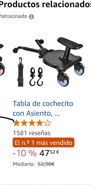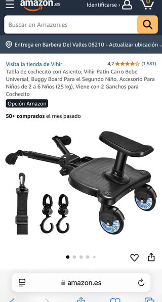 Accesorio para carrito de paseo Segboard. - Para niños de 2 a 5 años. - Peso máximo: 20 kg. - Se acopla a carritos con tubos traseros verticales y paralelos. - Sistema de suspensión en las ruedas. - Fácil instalación sin herramientas. Usado 2 dias solamente. Precio de venta 79e