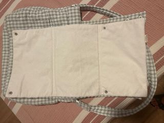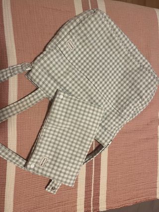 Conjunto de bolsa para carrito de bebé y su cambiador a juego, con un bonito estampado de cuadros Vichy en tonos grises y blancos. - Diseño de cuadros Vichy. - Incluye cambiador. - Cierre con botones a presión.