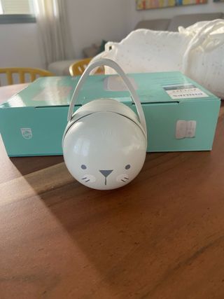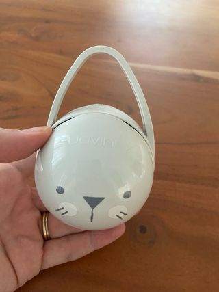 Porta chupetes de la marca Suavinex, ideal para el carrito del bebé. Se encuentra en perfecto estado, como nuevo. - Diseño blanco con cara de animal. - Asa para colgar.
