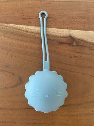 Portachupetes de la marca Suavinex, con diseño de gatito y colgador para carrito. Es de color azul y está sin usar. - Material de silicona. - Cierre de seguridad.